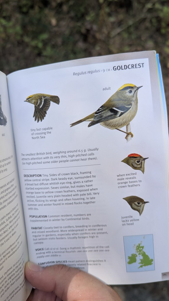 I do not move with speed. I have my binoculars and my plant identification app, and I stop all the time. I stand under the trees, staring up, trying to spot the tiny birds calling among the leaves. I dedicated at least ten minutes to trying to catch a glimpse of goldcrests north of the lane. My RSPB book tells me they are the smallest British bird at only 6.5g, and that gets me interested when previously I have paid very little attention.