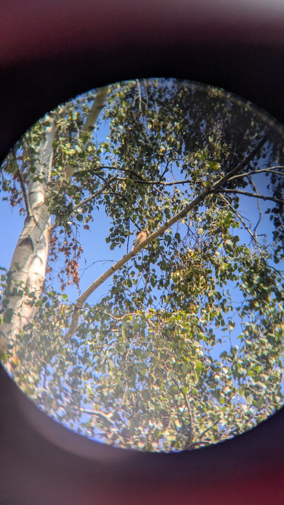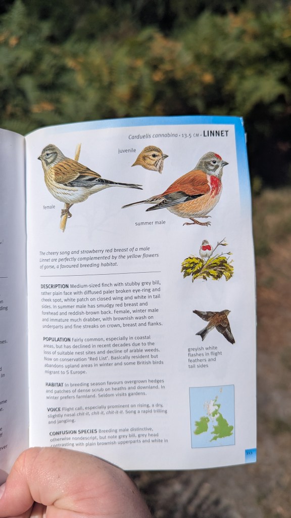 I stopped on the Common and spent some time watching linnets in a tall silver birch, their distinctive call reaching all around me. The male’s rose blush plumage gave him the appearance of a reddened leaf among the foliage.